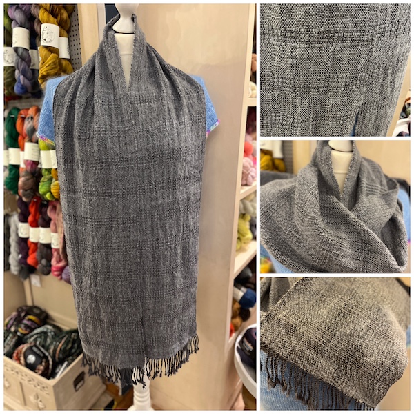 Ganz klassisch wirkt der neue WEBSCHAL IN LEINWAND- UND WAFFELBINDUNG von Renate, den sie mt WOOLFINEST von Schoppel und BABY SILK YAK von Gabo Wool gewebt hat.