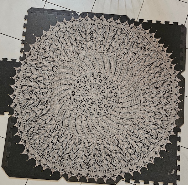 Ein Meisterstück ist der EZ 100TH ANNIVERSARY PI SHAWL CAMPING von Mwaa Knit. Dieses Kunstwerk hat Simone mit einem Strang CENTOLAVAGGI von Filatura di Crosa gestrickt.