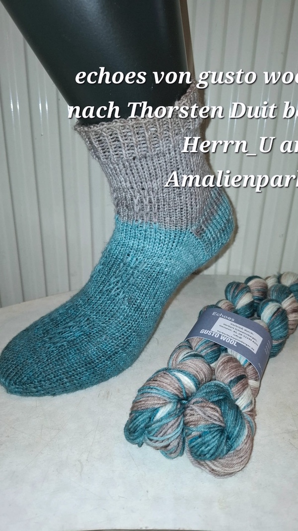 Regina liebt es, die TOE UP-SOCKEN von Thorsten Duit zu stricken. Dieses Paar hat sie mit ECHOES von Gusto Wool gestrickt.