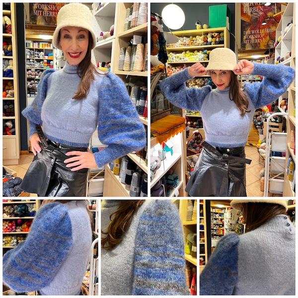 Diesen eleganten PUFFÄRMEL-PULLOVER ITO-YUU von Eri Shimizu hat Kathrin mit VIVIENNE von Sesia gestrickt. Da sie bei der NORDFRIESISCHEN MASCHENZEIT auf Hallig Oland Silk Mohair selbst gefärbt hat, hat Kathrin diese Eigenkreation für die Ärmel genommen. Toller Farbeffekt.