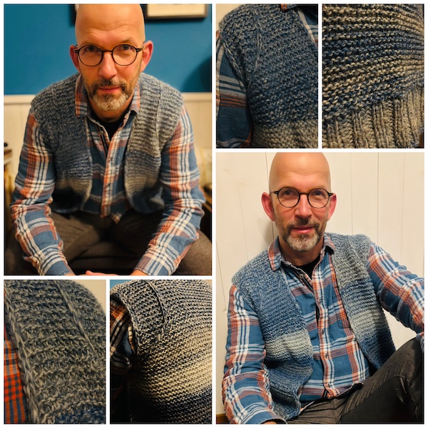 Die NOA VEST hat es Herrn U angetan in dem Moment, wo ChrisBerlin sie bei uns am Amalienpark präsentiert hat. Mit RE:TREAT TWIST von West Yorkshire Spinners und Nadelstärke 7 hat er sie schnell umgesetzt.