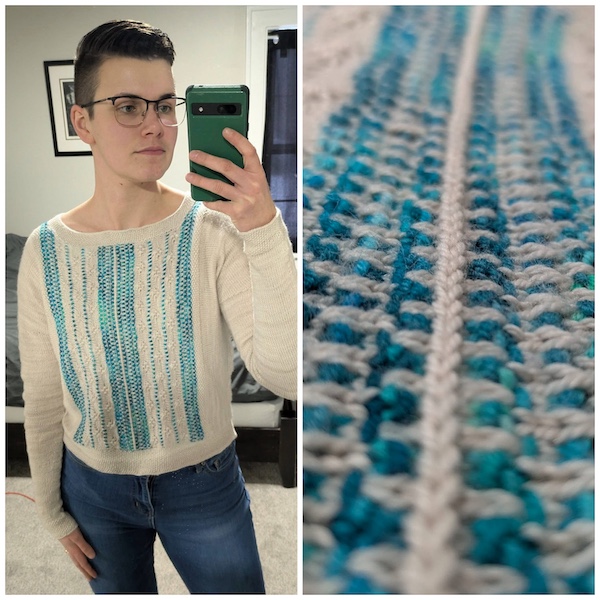 Mit der damaligen Jubiläumsfarbe AGNES AHOI von Chestnut Cabin und einem Garn aus ihrem Wollgeschäft in Cleveland/Ohio hat Herr Us Nichte Celine diesen schicken PULLOVER MAERON von Natasja Hornby gestickt.