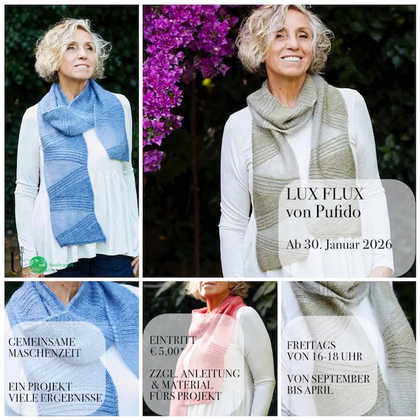 Als nächstes Projekt unserer GEMEINSAMEN MASCHENZEIT tauchen wir gemeinsam in etwas ganz Besonderes ein: den Schal LUX FLUX von Pufido. Feine, transparente und geschlossene Dreiecke legen sich wie Dachziegel sanft übereinander, spielen miteinander und werden liebevoll verziert.